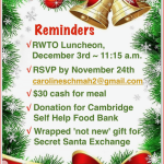 P.S. – RSVP to your caller by November 24th. The cost is $30.00 and donations of food or cash will go directly to the Cambridge Self Help Food Bank.
