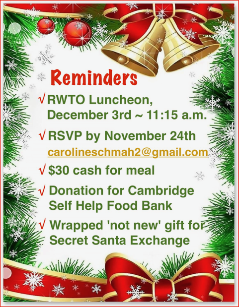 P.S. – RSVP to your caller by November 24th. The cost is $30.00 and donations of food or cash will go directly to the Cambridge Self Help Food Bank.