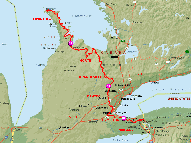 The Bruce Trail is a hiking trail in southern Ontario, from the Niagara River to the tip of Tobermory, Ontario. As Canada’s oldest and longest marked footpath, the Bruce Trail connects you to the wonders of the Niagara Escarpment. The main trail is more than 890 km long and there are over 400 km of associated side trails.